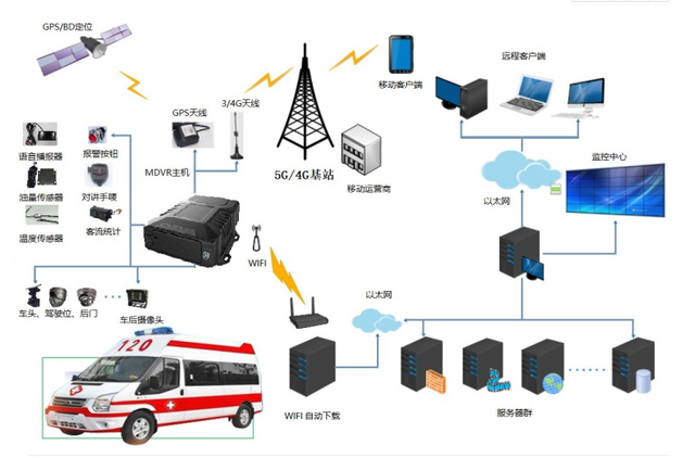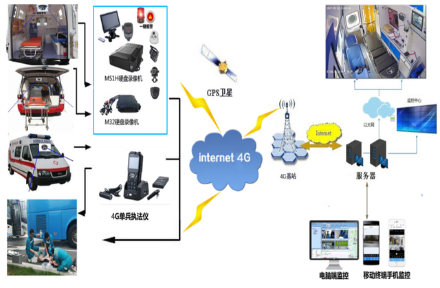 救護車實時視頻監控系統,通過前端安裝在救護車攝像機,將救護車的實時圖像通過無線4G網絡傳輸到應急指揮調度中心的大屏幕上。同時本系統也能將定時GPS信息通過4G無線網絡傳輸到監控中心實時報告救護車的位置。