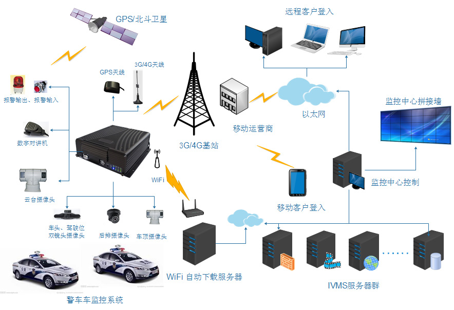 服務(wù)器監(jiān)控中心是由IVMS服務(wù)器群、后臺管理軟件、客戶端軟件及短信貓構(gòu)成的遠程監(jiān)控與管理中心,可以接入公安專用網(wǎng)絡(luò)作為公共交通預(yù)警指揮系統(tǒng)的數(shù)據(jù)來源。整個監(jiān)控中心采用集中化、分布式網(wǎng)絡(luò)管理架構(gòu),可同時實現(xiàn)多臺車輛的遠程實時監(jiān)控、錄像、抓拍;錄像搜索、下載、分析回放;查詢行車軌跡并回放及報警信息,并結(jié)合GIS電子地圖快速定位報警車輛的地理位置及現(xiàn)場視頻等。同時,配置數(shù)字對講機后可實現(xiàn)平臺與單輛/多輛之間的對講;安裝LED顯示屏可發(fā)布公益或者交通疏散信息;在停車場配置WiFi自動下載服務(wù)器,可自動將監(jiān)控錄像文件下載到指定的服務(wù)器存儲。